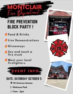 Fire Prevention Block Party – Oct 5 By watchung | October 2, 2024 | Comments Off on Fire Prevention Block Party – Oct 5 Join the Montclair Fire Department at Nishuane Park! Food, drinks, live demos, giveaways, and get to meet your local firefighters. WHEN: October 5 |11am-2pm WHERE: Harrison Ave, by Nishuane Park Posted in News and tagged watchung