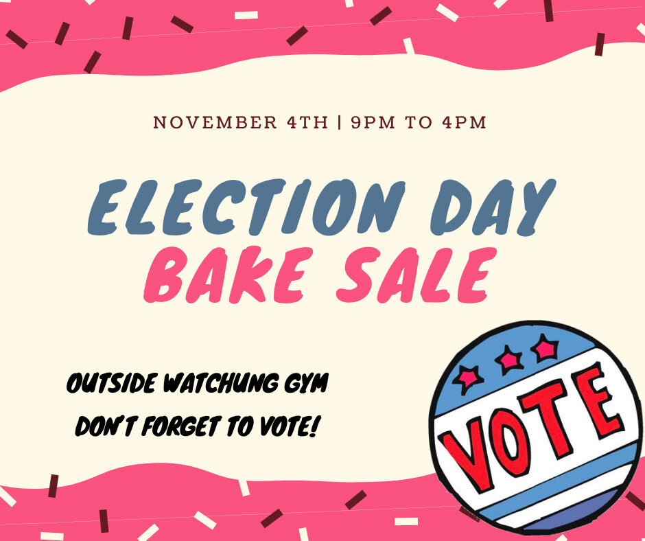 11/4 | Election Day Bake Sale By watchung | October 30, 2025 | Comments Off on 11/4 | Election Day Bake Sale Calling all Bakers! We will be holding the famous Watchung Election Day Bake Sale next Tuesday, November 4! Please sign up to volunteer or make something! Signup Here Posted in School Events and tagged watchung